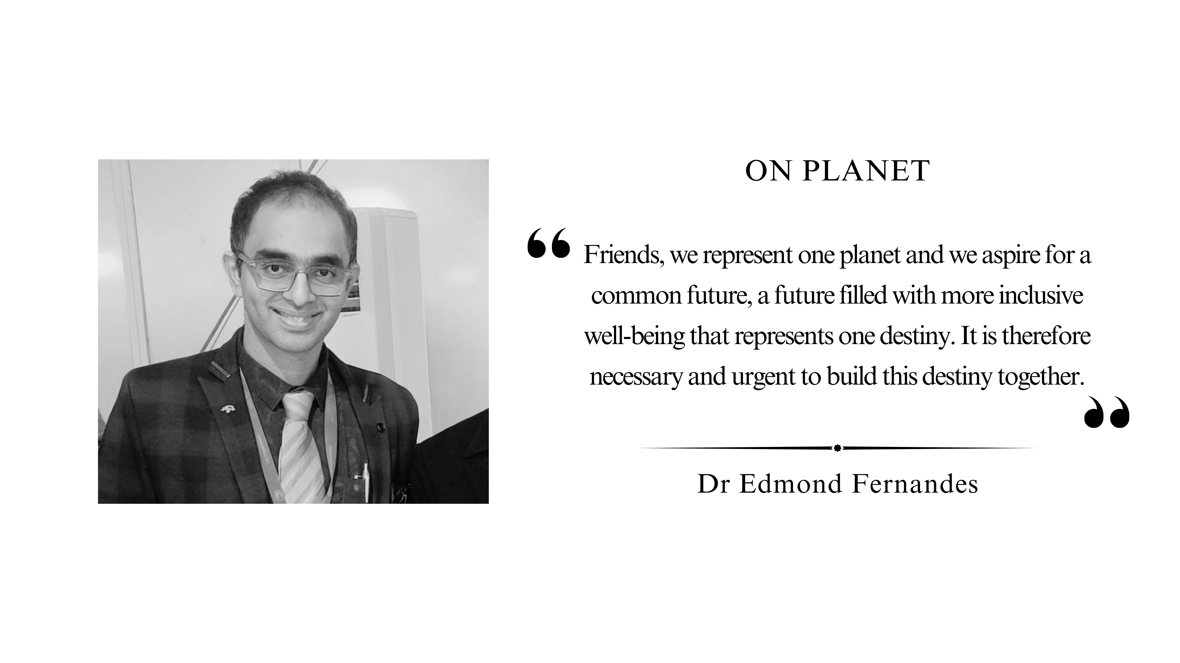 Friends, we represent one planet and we aspire for a common future, a future filled with more inclusive well-being that represents one destiny. It is therefore necessary and urgent to build this destiny together.