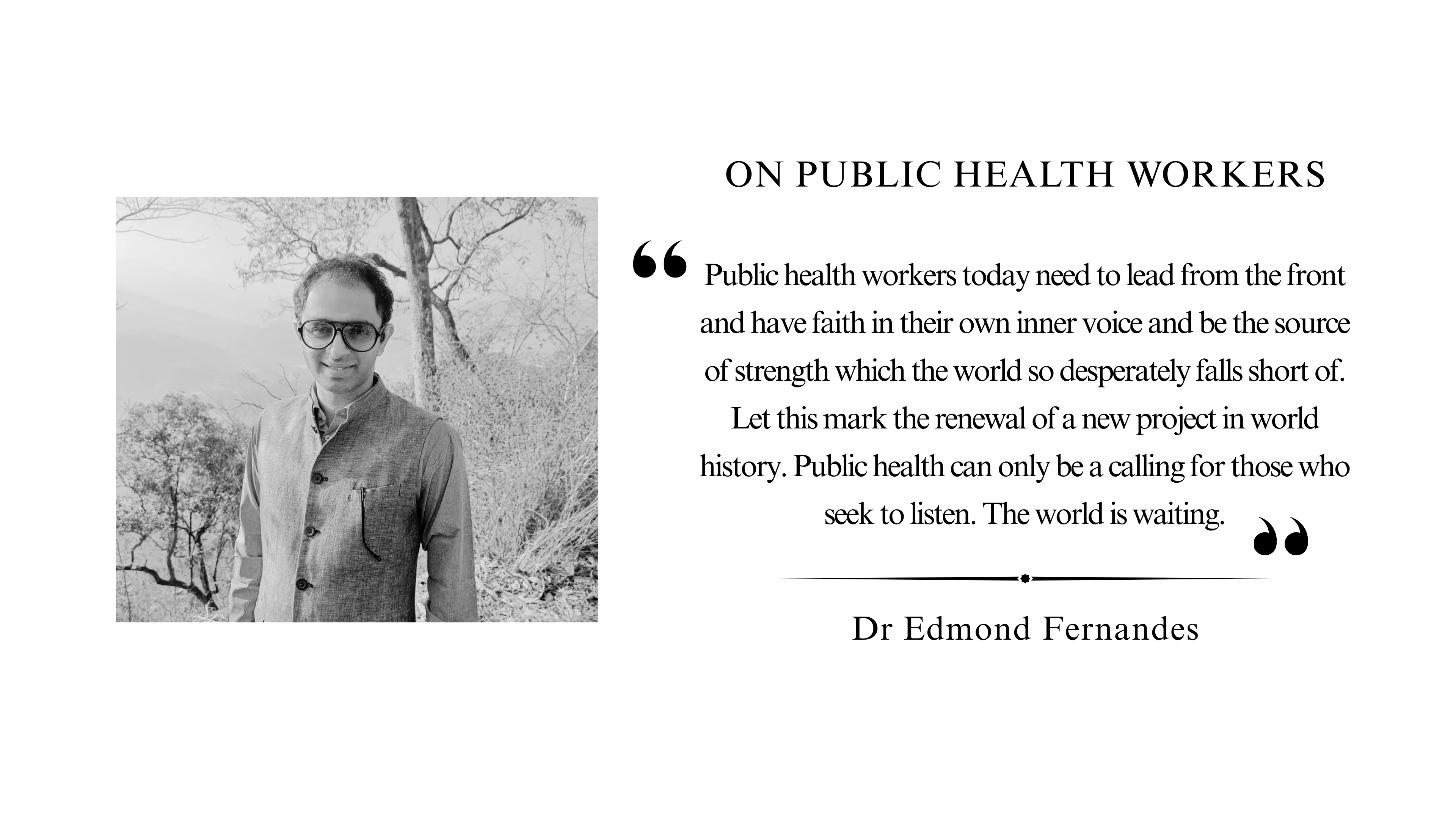 Public health workers today need to lead from the front and have faith in their own inner voice and be the source of strength which the world so desperately falls short of. Let this mark the renewal of a new project in world history. Public health can only be a calling for those who seek to listen. The world is waiting.