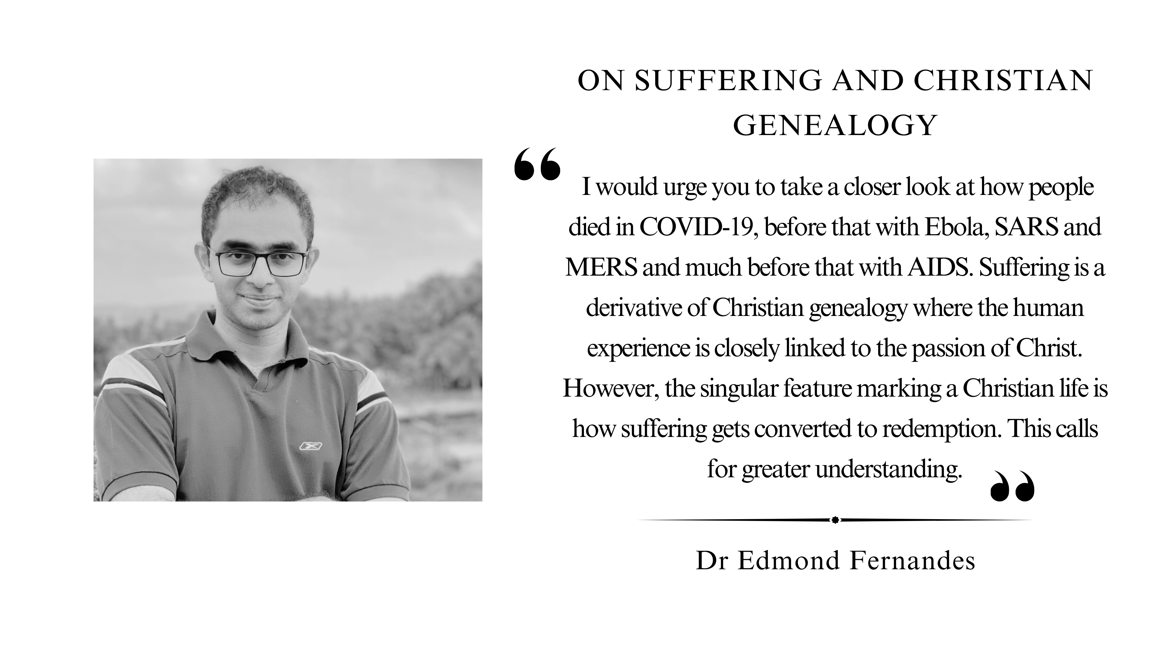 I would urge you to take a closer look at how people died in COVID-19, before that with Ebola, SARS and MERS and much before that with AIDS. Suffering is a derivative of Christian genealogy where the human experience is closely linked to the passion of Christ. However, the singular feature marking a Christian life is how suffering gets converted to redemption. This calls for greater understanding.