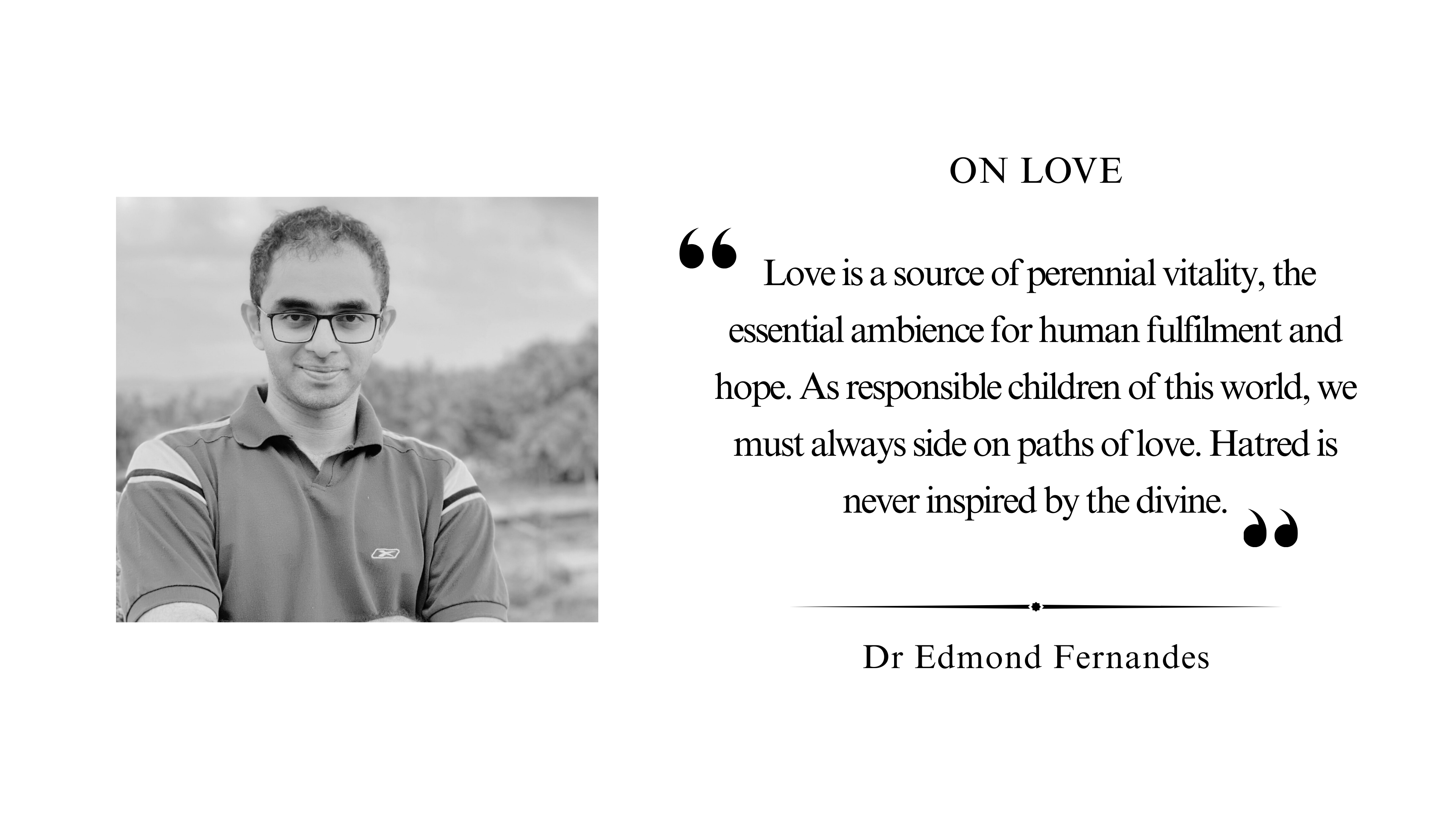 Love is a source of perennial vitality, the essential ambience for human fulfillment and hope. As responsible children of this world, we must always side on paths of love. Hatred is never inspired by the divine.