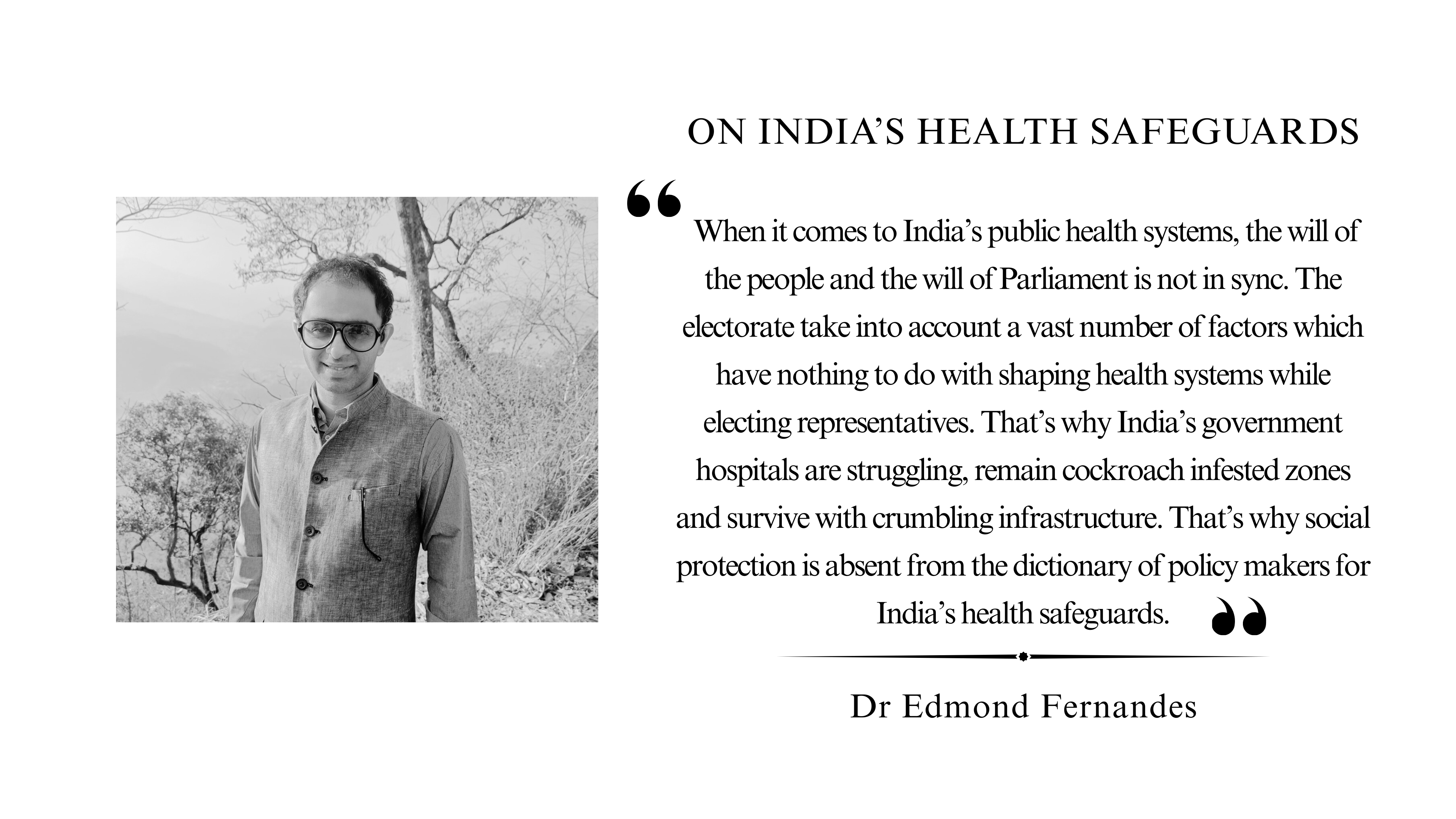 When it comes to India’s public health systems, the will of the people and the will of Parliament is not in sync. The electorate take into account a vast number of factors which have nothing to do with shaping health systems while electing representatives. That’s why India’s government hospitals are struggling, remain cockroach infested zones and survive with crumbling infrastructure. That’s why social protection is absent from the dictionary of policy makers for India’s health safeguards.