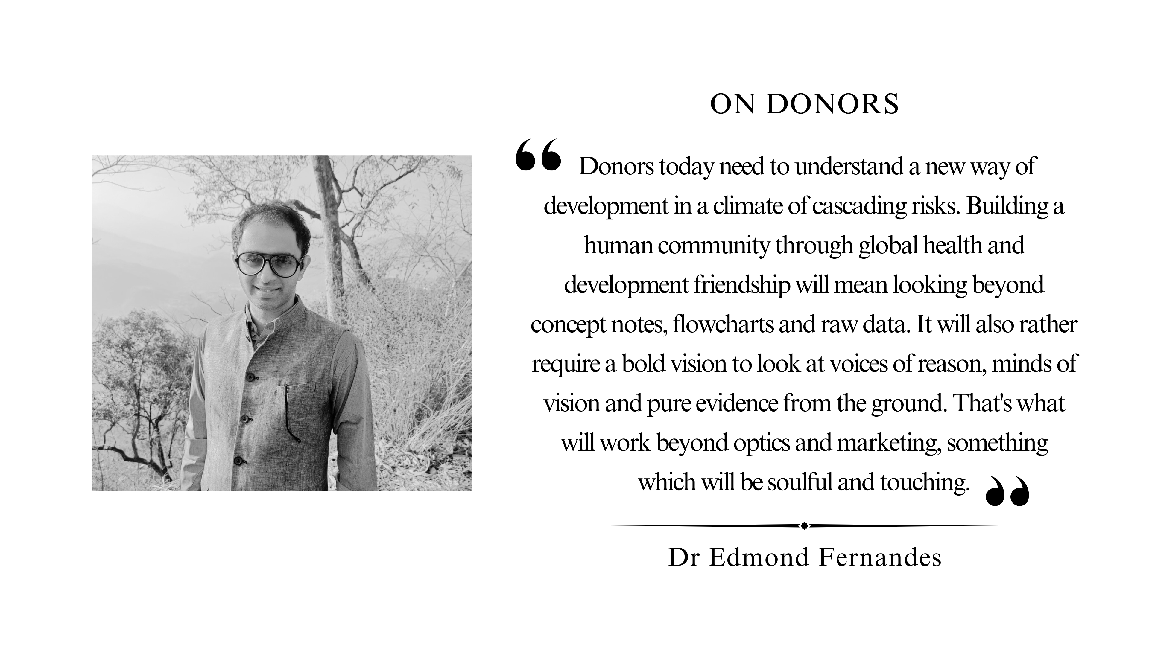 Donors today need to understand a new way of development in a climate of cascading risks. Building a human community through global health and development friendship will mean looking beyond concept notes, flowcharts and raw data. It will also rather require a bold vision to look at voices of reason, minds of vision and pure evidence from the ground. That's what will work beyond optics and marketing, something which will be soulful and touching.